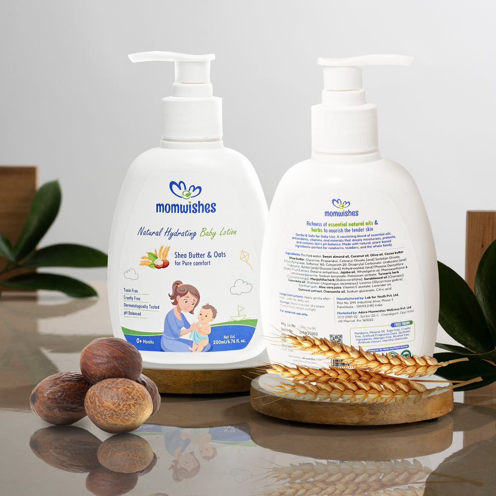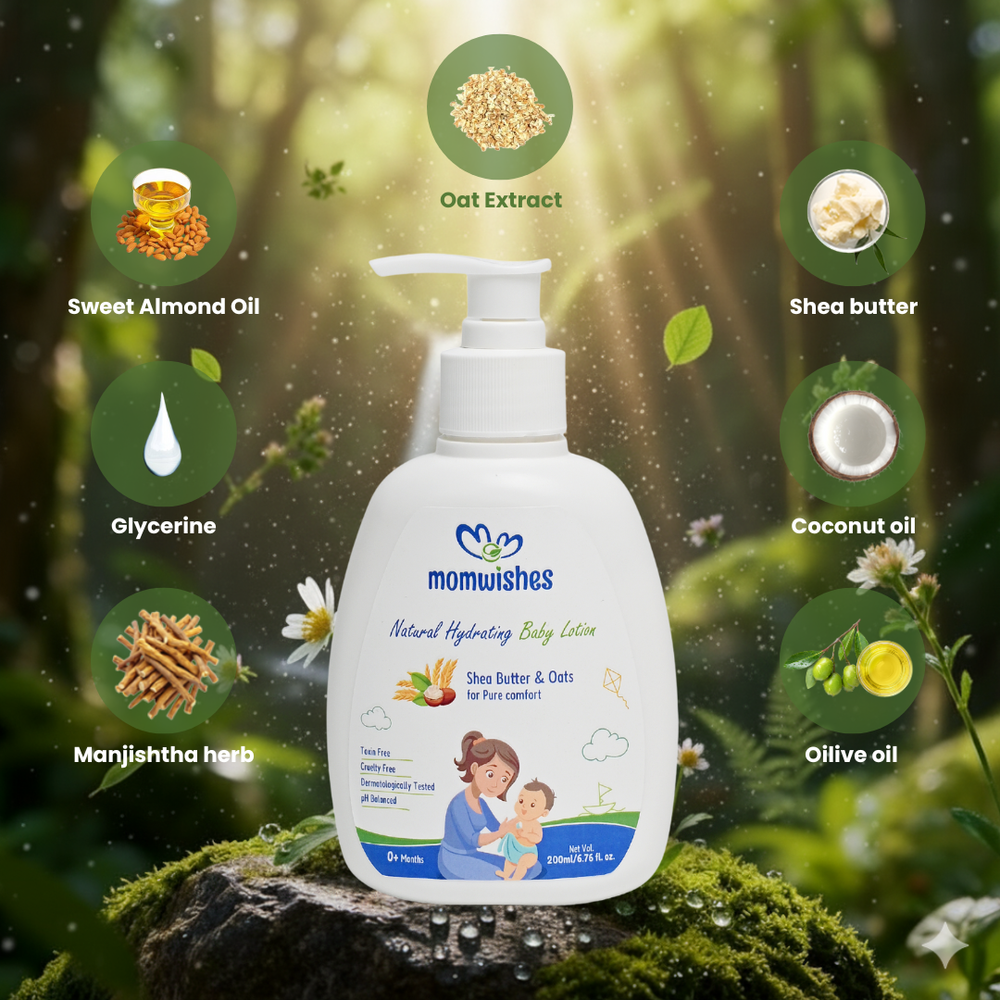 Because your baby’s skin deserves the purest care. MomWishes Baby Lotion is made with plant-derived, toxin-free ingredients and free from parabens, silicones, and harsh chemicals. It’s pediatrician-trusted, deeply nourishing, and specially created for Indian weather and skin types — ensuring long-lasting hydration without stickiness.